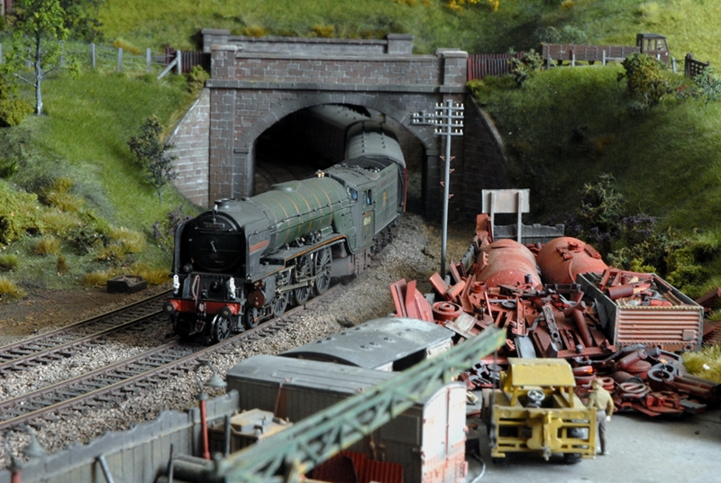 The operation of the layout centres on the loco depot so that, whilst an occasional train passes on the main line at the front, the main activity relates to the servicing of the engines in the depot area. Locos arriving from the main line visit each part of the depot as they are cleaned, turned, coaled and then stationed on shed ready for their next turn of duty.